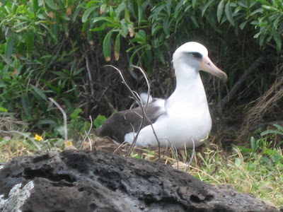 After the tuna auction we drove to the north west side of the island to go for our hike to find monk seals. That is when we saw the whales breaching. After the whale's show, we hiked for about an hour along a very muddy path (it rained a lot yesterday, and some today, too) with the mountains rising sharply to our left and the largest ocean waves I have ever seen to our right. The waves were about 20 feet tall, and it was very windy. Near the end of the trail, laysan albatrosses were nesting among the dunes. These are large and impressive seabirds that have a very wide wingspan and make long migrations. Frigate birds also soared overhead. Beyond the albatross nests, we came the end of point. Two Hawaiian monk seals lay on the sand among the rocks below us. They don't do much on land - they expend a lot of energy hunting in the ocean and haul up on the beach to rest and be lazy where predators cannot reach them. These animals represent the third endangered species we've seen today (humpback whales, laysan albatrosses, and now Hawaiian monk seals). Truly a once-in-a-life time opportunity.